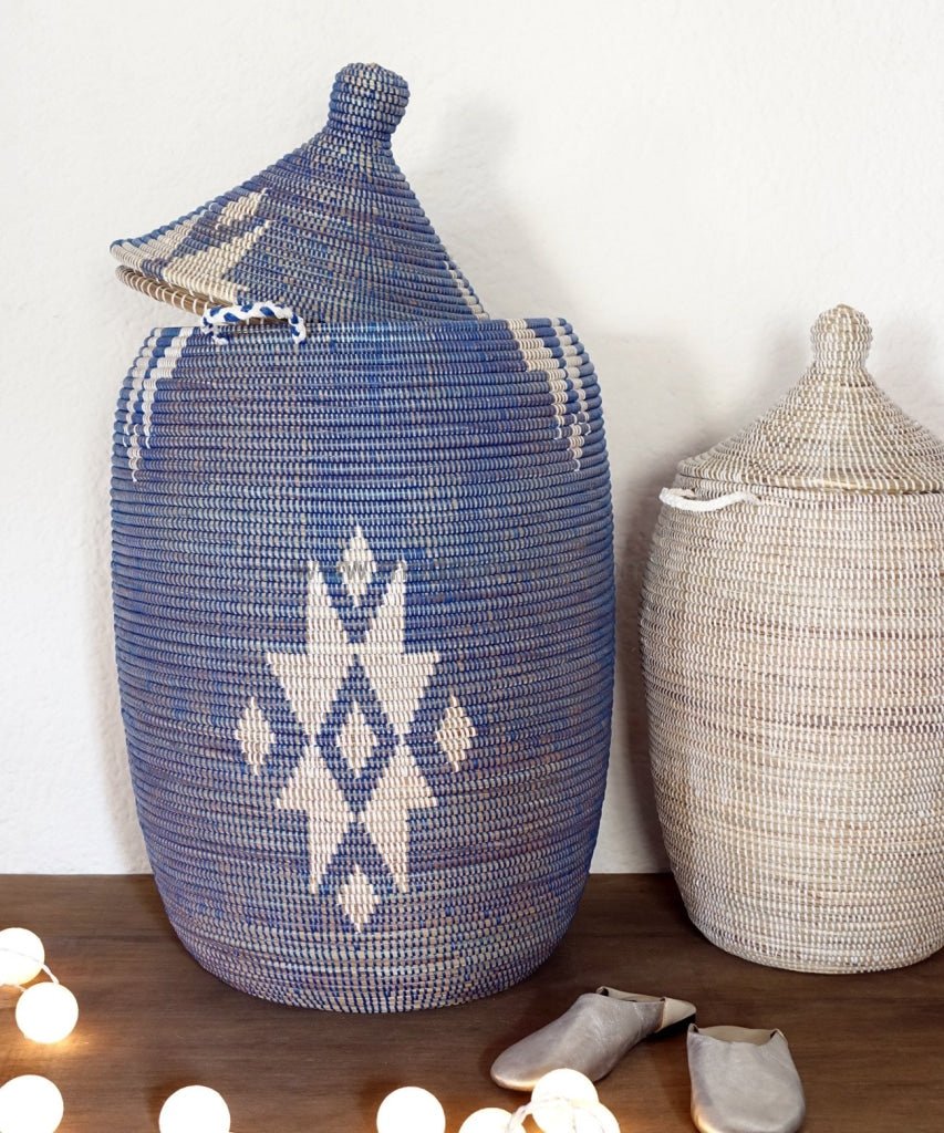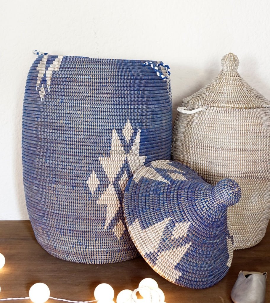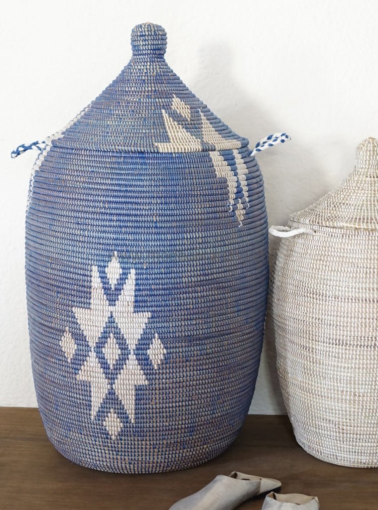 Cesta de lavandería extra grande en azul con patrón blanco.