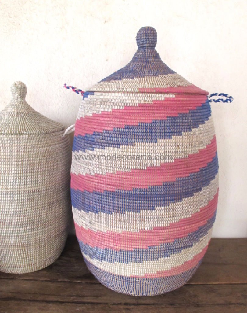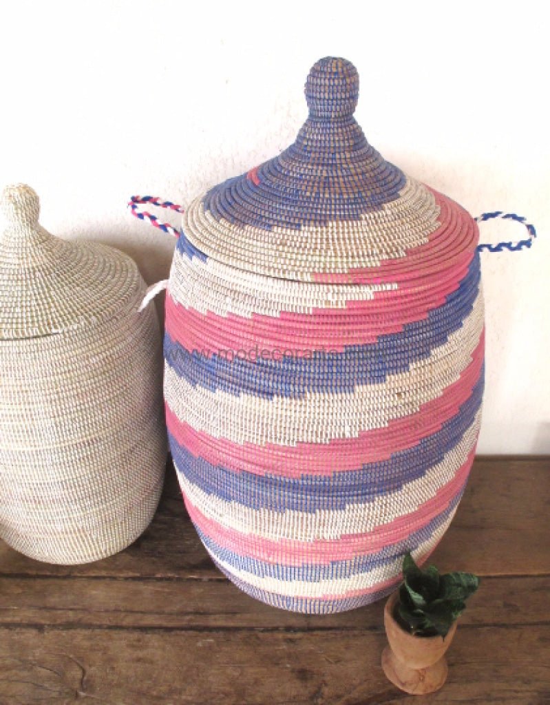 Cesta de lavandería hecha a mano (XL) en blanco, rosa y azul/Cesta de lavandería