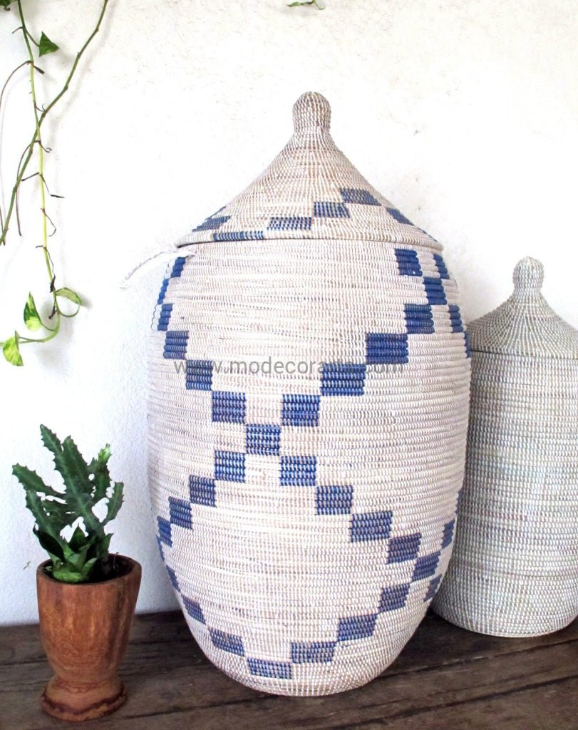 Cesta de lavandería (XXL) en blanco con patrón azul/cesto de lavandería
