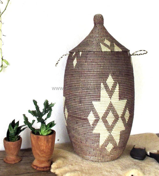 Cesto per la biancheria ecologico (XL) in marrone con fiori tribali / Cesto portabiancheria intrecciato a mano in stile senegalese