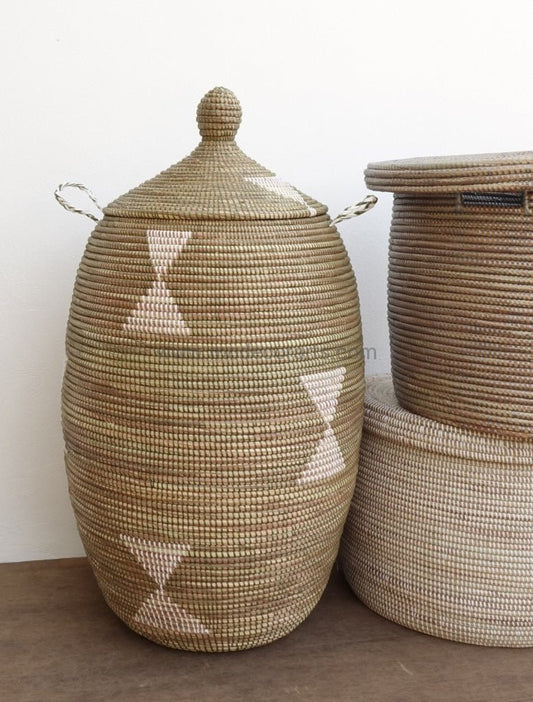 Cesto per la biancheria intrecciato a mano ecologico (XL) in bianco con motivo nero / Cesto portabiancheria senegalese