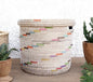 Cestino portaoggetti bianco di forma rotonda con coperchio piatto con motivo multicolore.